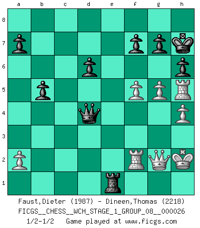 Last move : 1/2-1/2 2023 January 13 17:35:38 [Event "FICGS__CHESS__WCH_STAGE_1_GROUP_08__000026"] [Site "FICGS"] [Date "2022.11.02"] [Round "2"] [White "Faust,Dieter"] [Black "Dineen,Thomas"] [Result "1/2-1/2"] [WhiteElo "1987"] [BlackElo "2218"] 1.c4 e5 2.Nc3 Nf6 3.Nf3 Nc6 4.d4 exd4 5.Nxd4 Bb4 6.Bg5 h6 7.Bh4 Bxc3+ 8.bxc3 Ne5 9.f4 Ng6 10.Bxf6 Qxf6 11.g3 O-O 12.Bg2 Re8 13.O-O Nf8 14.Rb1 Ne6 15.Rb5 c6 16.Rf5 Qd8 17.Rh5 Nxd4 18.cxd4 d6 19.f5 Qf6 20.Rf2 Bd7 21.e4 Rad8 22.Rd2 b5 23.cxb5 cxb5 24.g4 Rc8 25.h4 Qe7 26.Rf2 Rc3 27.g5 Rg3 28.Rf4 Bxf5 29.exf5 Qe3+ 30.Rf2 Re4 31.Qc2 Qxd4 32.Qc8+ Kh7 33.Qb7 Re1+ 34.Kh2 Rxg2+ 35.Qxg2 1/2-1/2 Follow this game move after move (download)The boy (then a 12 year old boy named Anatoly Karpov) doesn't have a clue about Chess, and there's no future at all for him in this profession. (Mikhail Botvinnik) Ich würde mich als ganz normalen Jungen bezeichnen [Im Alter von 12]. (Sergej Karjakin) El Ajedrez expande y enriquece tu mente. (Saudin Robovic) Celui qui prend des risques peut perdre, celui qui n'en prend pas perd toujours. (Xavier Tartacover) Beta. Software undergoes beta testing shortly before it's released. Beta is latin for still doesn't work. (Anonymous)