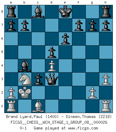 Last move : 0-1 2022 December 5 16:59:3 [Event "FICGS__CHESS__WCH_STAGE_1_GROUP_08__000026"] [Site "FICGS"] [Date "2022.11.02"] [Round "2"] [White "Brand Lyard,Paul"] [Black "Dineen,Thomas"] [Result "0-1"] [WhiteElo "1400"] [BlackElo "2218"] 1.e4 e6 2.d3 d5 3.e5 c5 4.c3 Nc6 5.f4 Nh6 6.h3 Qh4+ 7.Kd2 Qxf4+ 8.Kc2 Qxe5 9.Nf3 Qg3 10.Qe2 Nf5 11.Nbd2 c4 12.d4 Qg6 13.Kb1 Ng3 14.Ne4 Nxe2 15.b4 Qxe4+ 16.Kb2 Nxb4 17.cxb4 Bxb4 18.Bxe2 Qxe2+ 19.Nd2 Qd3 20.Nb3 c3+ 0-1 Follow this game move after move (download)All my games are real. (Bobby Fischer) Die Leute spielen gegen mich seit 15 Jahren unter Ihren Möglichkeiten. (Robert James Fischer) Yo no le temo a Spassky. Todos saben que yo soy el mejor. Uno no necesita un torneo para probarlo. (Bobby Fischer) Les échecs, c'est l'imagination. (David Bronstein) See no evil, hear no evil, speak no evil. (The 3 monkeys)