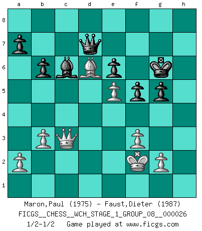 Last move : 1/2-1/2 2023 January 8 9:5:21 [Event "FICGS__CHESS__WCH_STAGE_1_GROUP_08__000026"] [Site "FICGS"] [Date "2022.11.02"] [Round "2"] [White "Maron,Paul"] [Black "Faust,Dieter"] [Result "1/2-1/2"] [WhiteElo "1975"] [BlackElo "1987"] 1.d4 Nf6 2.Nf3 e6 3.e3 b6 4.Bd3 Bb7 5.O-O c5 6.c4 cxd4 7.exd4 Be7 8.Nc3 d5 9.cxd5 Nxd5 10.Ne5 O-O 11.Qg4 f5 12.Qe2 Bf6 13.Bc4 Re8 14.Rd1 Nd7 15.Bb5 Bxe5 16.dxe5 Qe7 17.Qh5 g6 18.Nxd5 Bxd5 19.Qe2 Red8 20.Bd2 Nc5 21.Be3 Rac8 22.f3 g5 23.Rd4 Nd7 24.Bd2 Qc5 25.Be3 Qe7 26.Bd2 Qc5 27.Bc3 Nb8 28.Rad1 Nc6 29.Bxc6 Qxc6 30.Bb4 Rd7 31.b3 Kf7 32.h4 h6 33.Qd3 Qc2 34.Qb5 Qc6 35.Qe2 Kg8 36.Ba3 Qc2 37.R4d2 Qc6 38.Qf2 Rdc7 39.hxg5 hxg5 40.Rc1 Qd7 41.Rdc2 Rxc2 42.Rxc2 Rxc2 43.Qxc2 Kf7 44.Bd6 Kg6 45.Kf2 Bc6 46.Qc3 1/2-1/2 Follow this game move after move (download)Even the laziest King flees wildly in the face of a double check ! (Aaron Nimzowitsch) Strategie ist, wie man ein Mädchen auf den Rücksitz bekommt. Taktik ist, was man tut, wenn man dann dort ist. (Anonymous) La señal de un Gran Maestro es su habilidad de ganar una partida rápidamente y sin dolor. (Irving Chernev) Les Echecs ne sont pas pour les âmes timides. Ils requièrent un homme entier, qui ne s'arrête pas aveuglément à ce qui a été déjà établi, mais qui tente individuellement de sonder les profondeurs du jeu. (W. Steinitz) You can only get smarter by playing a smarter opponent. (Revolver, movie)