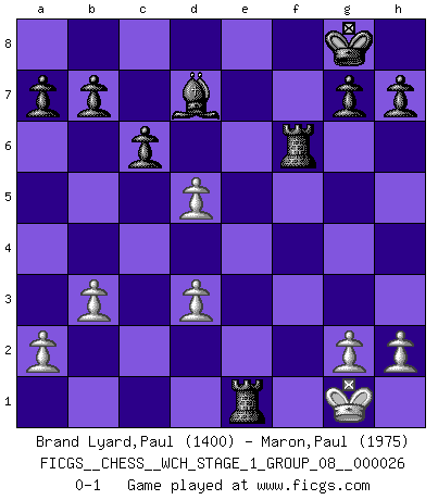 Last move : 0-1 2022 December 27 10:15:44 [Event "FICGS__CHESS__WCH_STAGE_1_GROUP_08__000026"] [Site "FICGS"] [Date "2022.11.02"] [Round "2"] [White "Brand Lyard,Paul"] [Black "Maron,Paul"] [Result "0-1"] [WhiteElo "1400"] [BlackElo "1975"] 1.e4 e6 2.Nc3 d5 3.Bb5+ c6 4.Bd3 Nd7 5.exd5 exd5 6.Bf5 Bd6 7.Bxd7+ Bxd7 8.d3 Ne7 9.Bg5 f6 10.Be3 Nf5 11.Nf3 Nxe3 12.fxe3 Qb6 13.b3 Bb4 14.Qd2 Qa5 15.Qc1 Bxc3+ 16.Nd2 O-O 17.Rb1 Rae8 18.O-O Bxd2 19.Qb2 Rxe3 20.Rxf6 Rxf6 21.c4 Re2 22.Qd4 Be3+ 23.Qxe3 Rxe3 24.cxd5 Qe1+ 25.Rxe1 Rxe1+ 0-1 Follow this game move after move (download)I'd rather have a Pawn than a finger. (Reuben Fine) Man kann eine Schachpartie nur gewinnen, wenn das Gleichgewicht gestört ist. In einer Stellung mit ungestörtem Gleichgewicht ist auch das größte Genie hilflos - in der Stellung steckt dann eben kein genialer Einfall. (Wilhelm Steinitz) A la fecha, Fischer esta simplemente un nivel arriba de todos los mejores jugadores de Ajedrez del mundo. (John Jacobs) La vie est comme un jeu d'échecs : nous esquissons un plan, mais celui-ci est tributaire de ce que daignent faire l'adversaire aux échecs et le destin dans la vie. (Arthur Schopenhauer) Only sick music makes money today. (Friedrich Nietzsche)