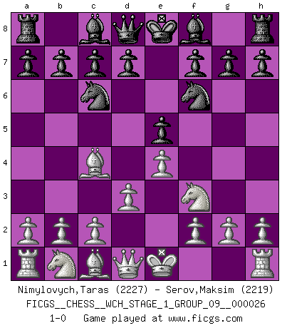 Last move : 1-0 2022 December 11 13:44:28 [Event "FICGS__CHESS__WCH_STAGE_1_GROUP_09__000026"] [Site "FICGS"] [Date "2022.11.02"] [Round "1"] [White "Nimylovych,Taras"] [Black "Serov,Maksim"] [Result "1-0"] [WhiteElo "2227"] [BlackElo "2219"] 1.e4 e5 2.Nf3 Nc6 3.Bc4 Nf6 4.d3 1-0 This chess game has been lost on time (started : 2022.11.02 13:52:9) Follow this game move after move (download)I look one move ahead... the best ! (Siegbert Tarrasch) Ich rechne überhaupt nicht voraus. Ich gewinne auch so. (Robert James Fischer) No es tiempo de jugar al Ajedrez cuando la casa esta en llamas. (Proverbio Italiano) Aucun coup ne doit être joué sans but. (Pedro Damiano) It's not the will to win, but the will to prepare to win that makes the difference. (Bear Bryant)