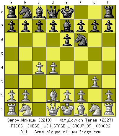 Last move : 0-1 2022 December 11 13:44:28 [Event "FICGS__CHESS__WCH_STAGE_1_GROUP_09__000026"] [Site "FICGS"] [Date "2022.11.02"] [Round "2"] [White "Serov,Maksim"] [Black "Nimylovych,Taras"] [Result "0-1"] [WhiteElo "2219"] [BlackElo "2227"] 1.d4 Nf6 2.c4 e6 3.g3 Bb4+ 4.Bd2 Be7 0-1 This chess game has been lost on time (started : 2022.11.02 13:52:9) Follow this game move after move (download)What would Chess be without silly mistakes ? (Kurt Richter) Ich brauche nur einen Blick auf das Schachbrett zu werfen, und weiß schon, was in der Stellung steckt, was geschehen kann und was geschehen wird. Alle übrigen suchen und prüfen, ich aber weiß es! (José Raúl Capablanca) Estaba muy claro de que el punto vulnerable del Gran Maestro Americano (Bobby Fischer) radicaba en las posiciones de doble filo, colgantes, irracionales, donde el siempre falló en encontrar un triunfo aún en una posición de clara victoria. (Efim Geller) Le jeu d'échecs est comme rejeté hors du temps. (Antoine de Saint-Exupéry) Experiences are the keys to life. (Daniel Parmet)