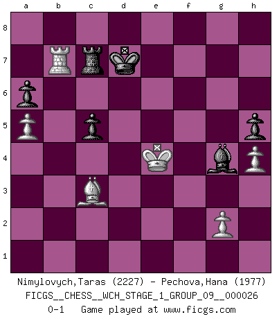 Last move : 0-1 2023 May 26 0:16:34 [Event "FICGS__CHESS__WCH_STAGE_1_GROUP_09__000026"] [Site "FICGS"] [Date "2022.11.02"] [Round "2"] [White "Nimylovych,Taras"] [Black "Pechova,Hana"] [Result "0-1"] [WhiteElo "2227"] [BlackElo "1977"] 1.e4 e5 2.Nf3 Nc6 3.Bc4 Nf6 4.d3 Bc5 5.O-O d6 6.c3 a6 7.a4 h6 8.Re1 O-O 9.b4 Ba7 10.h3 Ne7 11.Nbd2 Ng6 12.d4 exd4 13.cxd4 d5 14.exd5 Nxd5 15.Nb3 c6 16.Bd2 Be6 17.Nc5 Bxc5 18.bxc5 Ne3 19.Rxe3 Bxc4 20.Rb1 Rb8 21.Ne5 Qxd4 22.Nxg6 fxg6 23.Qc2 Bf7 24.Bc3 Qxc5 25.Qb2 Rfe8 26.Re5 Qd6 27.Rxe8+ Rxe8 28.Bxg7 g5 29.a5 c5 30.Bh8 Qg6 31.Rd1 g4 32.h4 Kh7 33.Bc3 g3 34.Qxb7 gxf2+ 35.Kxf2 Kg8 36.Qd7 Qc2+ 37.Qd2 Qxd2+ 38.Rxd2 h5 39.Kf3 Be6 40.Kf4 Bg4 41.Rd6 Re6 42.Rd5 Rc6 43.Rd8+ Kf7 44.Ke4 Ke6 45.Re8+ Kd7 46.Rb8 Rc8 47.Rb7+ Rc7 0-1 This chess game has been lost on time (started : 2022.11.02 13:52:9) Follow this game move after move (download)Chess is really ninety nine percent calculation. (Soltis) Spiel ein langweiliges Spiel zu Ende und lustige Dinge können passieren. (Hans Ree) El Ajedrez, como cualquier actividad creativa, solo puede existir a través del esfuerzo combinado de aquellos que tienen talento creativo y de aquellos que poseen la habilidad de organizar su trabajo creativo. (Mikhail Botvinnik) Echiquier : carré parfait, comme la Jérusalem nouvelle décrite par l'auteur de l'Apocalypse, huit cases sur huit, exaltation du chiffre 4, symbole du cosmos aux quatre horizons... où le noir et le blanc, l'ombre et la lumière, le mal et le bien s'entremêlent et se conjuguent. (Robert Couffignal, Le Gambit du poète) Pushing plastic is for the many, pushing virtual pieces is for the fewer, pushing wood is for the very few. (Normajean Yates)