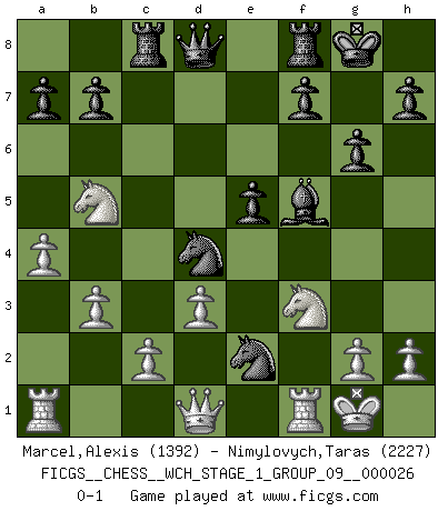 Last move : 0-1 2022 November 24 6:18:12 [Event "FICGS__CHESS__WCH_STAGE_1_GROUP_09__000026"] [Site "FICGS"] [Date "2022.11.02"] [Round "1"] [White "Marcel,Alexis"] [Black "Nimylovych,Taras"] [Result "0-1"] [WhiteElo "1392"] [BlackElo "2227"] 1.f4 d5 2.Nf3 g6 3.e3 Bg7 4.Nc3 Nf6 5.b3 O-O 6.Bb2 c5 7.Be2 d4 8.exd4 cxd4 9.Nb5 Nd5 10.Bxd4 Bxd4 11.Nbxd4 Nxf4 12.O-O e5 13.Nb5 Nc6 14.Nc3 Bf5 15.d3 Nd4 16.a4 Rc8 17.Nb5 Nfxe2+ 0-1 Follow this game move after move (download)The Chess pieces are the block alphabet which shapes thoughts; and these thoughts, although making a visual design on the chessboard, express their beauty abstractly, like a poem. (Marcel Duchamp) Ich moechte nie einem Club beitreten, der Leute wie mich als Mitglieder aufnimmt. (Woody Allen) El Ajedrez es 99 por ciento táctica. (Teichmann) La guerre est enfant de la passion, la passion est enfant du narcissisme et le narcissisme est l'enfant. (...) Une autre partie ? (Thibault de Vassal) True nature is revealed in times of difficulty. (Chinese proverb)
