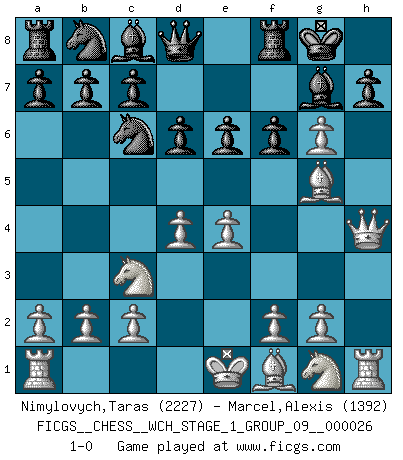 Last move : 1-0 2022 November 8 18:14:41 [Event "FICGS__CHESS__WCH_STAGE_1_GROUP_09__000026"] [Site "FICGS"] [Date "2022.11.02"] [Round "2"] [White "Nimylovych,Taras"] [Black "Marcel,Alexis"] [Result "1-0"] [WhiteElo "2227"] [BlackElo "1392"] 1.e4 g6 2.d4 Bg7 3.Nc3 e6 4.h4 Ne7 5.h5 O-O 6.Qg4 d6 7.Qh4 Nec6 8.Bg5 f6 9.hxg6 1-0 Follow this game move after move (download)When you don't know what to play, wait for an idea to come into your opponent's mind. You may be sure that idea will be wrong. (Siegbert Tarrasch) Ohne Fehler kann es keine Brillanz geben. (Emanuel Lasker) Debió haber existido una vez en que los hombres eran semidióses, de otra manera no hubiesen podido inventar el Ajedrez. (Gustav Schenk) Les réformistes prétendent que les progrès de la théorie conduiront à la disparition des échecs, et qu'il faut, pour leur rendre vie, en remanier les règles. En réalité, qu'exprime cette affirmation? Le mépris de l'intuition, de l'imagination et de tous les autres éléments qui font des échecs un art. (Alexander Alekhine) Nowadays, anyone who cannot speak English and is incapable of using the Internet is regarded as backward. (Al-Waleed bin Talal)