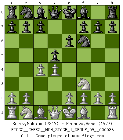Last move : 0-1 2022 December 28 13:27:15 [Event "FICGS__CHESS__WCH_STAGE_1_GROUP_09__000026"] [Site "FICGS"] [Date "2022.11.02"] [Round "1"] [White "Serov,Maksim"] [Black "Pechova,Hana"] [Result "0-1"] [WhiteElo "2219"] [BlackElo "1977"] 1.d4 Nf6 2.c4 e6 3.Nf3 d5 0-1 This chess game has been lost on time (started : 2022.11.02 13:52:9) Follow this game move after move (download)The beauty of a move lies not in its' appearance but in the thought behind it. (Siegbert Tarrasch) Es ist peinlich, dass ich nie Weltmeister wurde. Es wäre leicht, Leonid Breschnjew als Ursache vorzuschieben, dessen Apparat den Vorzeigekommunisten Anatoli Karpow in allem unterstützte. Aber Garri Kasparow zum Beispiel, der ebenfalls von den Sowjets unerwünscht war, hat trotz der Widerstände den WM-Titel erobert. (Viktor Kortschnoi) Si no le temes a Spassky, entonces elimino el elemento del dinero. (Jim Slater) Seul un grand joueur sait à quel point il joue faiblement. (Xavier Tartacover) Men never do evil so completely and cheerfully as when they do it from religious conviction. (Blaise Pascal)