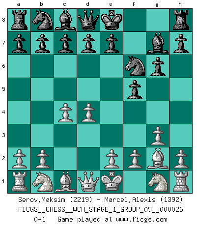 Last move : 0-1 2022 December 8 22:4:59 [Event "FICGS__CHESS__WCH_STAGE_1_GROUP_09__000026"] [Site "FICGS"] [Date "2022.11.02"] [Round "1"] [White "Serov,Maksim"] [Black "Marcel,Alexis"] [Result "0-1"] [WhiteElo "2219"] [BlackElo "1392"] 1.d4 f5 2.g3 Nf6 3.c4 g6 4.Bg2 Bg7 0-1 This chess game has been lost on time (started : 2022.11.02 13:52:9) Follow this game move after move (download)Methodical thinking is of more use in Chess than inspiration. (C. J. S. Purdy) Die westlichen Werte sind eine Sprache, welche die Putin-Administration nicht versteht. (Garry Kasparov) El Ajedrez es como la guerra en un tablero. (Bobby Fischer) Vouloir jouer aux échecs contre soi-même est aussi paradoxal que vouloir marcher sur son ombre. (Stefan Zweig) I fear not the man who has practiced 10,000 kicks once, but I fear the man who has practiced one kick 10,000 times. (Bruce Lee)