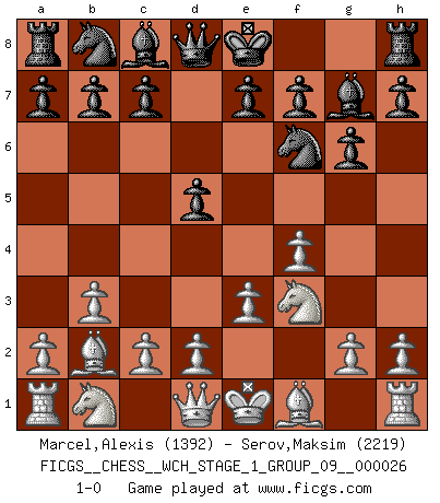 Last move : 1-0 2022 December 8 22:4:59 [Event "FICGS__CHESS__WCH_STAGE_1_GROUP_09__000026"] [Site "FICGS"] [Date "2022.11.02"] [Round "2"] [White "Marcel,Alexis"] [Black "Serov,Maksim"] [Result "1-0"] [WhiteElo "1392"] [BlackElo "2219"] 1.f4 d5 2.Nf3 g6 3.e3 Nf6 4.b3 Bg7 5.Bb2 1-0 This chess game has been lost on time (started : 2022.11.02 13:52:9) Follow this game move after move (download)A great player and a great example for many. His book My 60 Memorable Games had a big impact on me. It is a shame he didn't continue to enrich the world of chess with his unparalleled understanding after 1972. (Jan Timman, about Bobby Fischer's death) Es tut gut, die Entwicklungsperiode von, [...] demokratischem Geist durchdringen zu lassen. Wie undemokratisch wäre es doch beispielsweise, den einen Offizier große Spaziertouren vornehmen zu lassen, während die anderen zu Hause säßen und sich entsetzlich langweilten. (Aaron Nimzowitsch) Si el Ajedrez es una ciencia, es la mas inexacta. Si el Ajedrez es un arte, es demasiado inexacto para ser visto como tal. Si el Ajedrez es un deporte, es demasiado esotérico. Si el Ajedrez es un juego, es demasiado exigente para ser solo un juego. Si el Ajedrez es una aventura, es una muy demandante. Si el Ajedrez es una pasión, es una muy gratificante. Si el Ajedrez es la vida, es una muy triste. (Anónimo) Les échecs, c'est l'imagination. (David Bronstein) Internal peace cannot coexist with external war. (Don Groves)