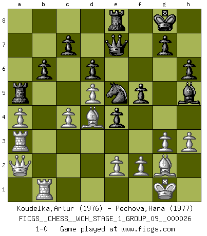 Last move : 1-0 2023 April 2 6:8:47 [Event "FICGS__CHESS__WCH_STAGE_1_GROUP_09__000026"] [Site "FICGS"] [Date "2022.11.02"] [Round "2"] [White "Koudelka,Artur"] [Black "Pechova,Hana"] [Result "1-0"] [WhiteElo "1976"] [BlackElo "1977"] 1.c4 e5 2.Nc3 Nf6 3.Nf3 Nc6 4.g3 Bb4 5.Bg2 O-O 6.O-O e4 7.Ne1 Bxc3 8.dxc3 h6 9.Nc2 d6 10.Ne3 Re8 11.b3 a5 12.a4 Qe7 13.Nd5 Nxd5 14.cxd5 Nb8 15.Be3 Bf5 16.Re1 Nd7 17.Qd2 Nc5 18.Reb1 b6 19.h3 Bg6 20.b4 Nd7 21.Ra3 Ne5 22.Qa2 f5 23.bxa5 Rxa5 24.c4 Bh5 25.Bd4 1-0 Follow this game move after move (download)It is difficult to play against Einstein's theory --on his first loss to Fischer. (Mikhail Tal) Frage: Wie viele Autos haben Sie schon zerstört? - Antwort: Nur zwei. (Loek van Wely) De todos mis libros Rusos, la defensa contiene y difunde el 'calor' mas grande que pudiese verse extraño al observar lo supremamente abstracto que el Ajedrez supuestamente es. (Vladimir Nabokov) Les Echecs, c'est l'art de la guerre sans les charniers, c'est la résurrection des morts tombés au champ d'honneur, l'espoir perpétuel, la suprématie de l'intelligence sur la force, la culture de l'esprit. (F. Szpiner) Games, world of games... There's always an opponent, and there's always a victim. (Revolver, movie)