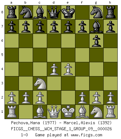 Last move : 1-0 2022 December 30 8:41:40 [Event "FICGS__CHESS__WCH_STAGE_1_GROUP_09__000026"] [Site "FICGS"] [Date "2022.11.02"] [Round "2"] [White "Pechova,Hana"] [Black "Marcel,Alexis"] [Result "1-0"] [WhiteElo "1977"] [BlackElo "1392"] 1.e4 g6 2.d4 Bg7 3.Nc3 1-0 This chess game has been lost on time (started : 2022.11.02 13:52:9) Follow this game move after move (download)I have always a slight feeling of pity for the man who has no knowledge of Chess. (Siegbert Tarrasch) Im Fernschach kannst du während dem Spiel rauchen. (John Christen Knudsen) El Ajedrez no es como la vida... ¡tiene reglas!. (Mark Pasternak) Il n'y a plus de joueurs du niveau de Jacob Murray dont la seule quête est le beau jeu, le plaisir de voir les pièces construire quelque chose. Sur 10 idées à la minute, 9 seront sans intérêt, la dernière s'avèrera géniale. (Christian Bauer) History is a gallery of pictures in which there are few originals and many copies. (Alexis de Tocqueville)