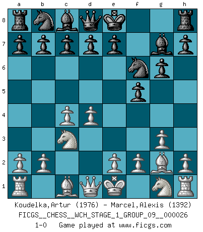 Last move : 1-0 2022 December 29 17:48:22 [Event "FICGS__CHESS__WCH_STAGE_1_GROUP_09__000026"] [Site "FICGS"] [Date "2022.11.02"] [Round "1"] [White "Koudelka,Artur"] [Black "Marcel,Alexis"] [Result "1-0"] [WhiteElo "1976"] [BlackElo "1392"] 1.d4 f5 2.c4 Nf6 3.Nc3 g6 4.g3 Bg7 5.Bg2 1-0 This chess game has been lost on time (started : 2022.11.02 13:52:9) Follow this game move after move (download)Fischer is under obligation to nobody. (Joseph Platz) Schachspieler können ausgezeichnet Varianten am Schachbrett berechnen, aber nicht im realen Leben. Zu stark ist der Individualismus im Schach ausgeprägt, und für viele ist ein kleiner momentaner persönlicher Vorteil wichtiger als ein weit größerer Vorteil von morgen. (Anatoly Karpov) ¿Que sería del Ajedrez sin errores graciosos?. (Kurt Richter) La victoire dans une partie d'Echecs appartient la plupart du temps à celui qui voit un peu plus loin que l'adversaire. (Lasker) Crush them ! Make them suffer ! (General Grievous in Star Wars ep.3)