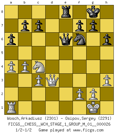 Last move : 1/2-1/2 2023 February 6 21:33:23 [Event "FICGS__CHESS__WCH_STAGE_1_GROUP_M_01__000026"] [Site "FICGS"] [Date "2022.11.02"] [Round "1"] [White "Wosch,Arkadiusz"] [Black "Osipov,Sergey"] [Result "1/2-1/2"] [WhiteElo "2301"] [BlackElo "2291"] 1.e4 e5 2.Nf3 Nc6 3.Bc4 Nf6 4.d3 Bc5 5.c3 d6 6.O-O O-O 7.Re1 a6 8.Bb3 Ba7 9.Nbd2 h6 10.h3 Re8 11.Nf1 Be6 12.Bxe6 Rxe6 13.Be3 Bxe3 14.Nxe3 Ne7 15.b4 d5 16.a4 dxe4 17.dxe4 Nxe4 18.Qc2 Nf6 19.Nc4 Ng6 20.Ncxe5 Nxe5 21.Nxe5 Qd6 22.Nc4 Qd5 23.Rxe6 Qxe6 24.Qd3 Re8 1/2-1/2 Follow this game move after move (download)The older I grow, the more I value pawns. (Paul Keres) Ich brauche nur einen Blick auf das Schachbrett zu werfen, und weiß schon, was in der Stellung steckt, was geschehen kann und was geschehen wird. Alle übrigen suchen und prüfen, ich aber weiß es! (José Raúl Capablanca) El jugador de combinación piensa hacia adelante; comienza de la posición dada y trabaja las movidas contundentes en su mente. (Emanuel Lasker) Même si l'adversaire joue le coup analysé précédemment, recommencez l'analyse en voyant la nouvelle position. Première règle de Blumenfeld Mac users swear by their computers. PC users swear at their computers. (Author unknown)