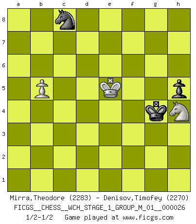Last move : 1/2-1/2 2023 March 26 3:3:27 [Event "FICGS__CHESS__WCH_STAGE_1_GROUP_M_01__000026"] [Site "FICGS"] [Date "2022.11.02"] [Round "1"] [White "Mirra,Theodore"] [Black "Denisov,Timofey"] [Result "1/2-1/2"] [WhiteElo "2283"] [BlackElo "2270"] 1.d4 d5 2.Nf3 Nf6 3.c4 c6 4.e3 e6 5.b3 Nbd7 6.Bd3 Bd6 7.Bb2 O-O 8.Nbd2 b6 9.e4 dxe4 10.Nxe4 Nxe4 11.Bxe4 Bb7 12.Bc2 c5 13.Qd3 Nf6 14.O-O-O Be4 15.Qe2 Bxc2 16.Kxc2 Qc7 17.dxc5 Qxc5 18.a3 Rfd8 19.Kb1 h6 20.Ka2 a6 21.h4 h5 22.Rhe1 b5 23.Rc1 Qb6 24.Red1 Rdc8 25.Ng5 bxc4 26.Rxc4 Rxc4 27.Qxc4 Be7 28.Qc2 Qc5 29.Qe2 Qb5 30.Qf3 Rc8 31.a4 Qb6 32.Rc1 Rxc1 33.Bxc1 Qd4 34.Kb1 Bd8 35.Qa8 Qd5 36.Qxd5 Nxd5 37.Kc2 Bb6 38.Nh3 Bd8 39.Ng5 Bb6 40.Nh3 Kf8 41.Kd3 Ke7 42.Kc4 Kd7 43.b4 Ba7 44.b5 axb5+ 45.axb5 f6 46.Ba3 Nb6+ 47.Kd3 Nc8 48.Bf8 g6 49.Ba3 e5 50.f4 Ke6 51.fxe5 Kxe5 52.Bb2+ Kf5 53.Bd4 Bxd4 54.Kxd4 Kg4 55.Kd5 Kxh4 56.Ke6 f5 57.Nf4 Kg3 58.Nxg6 f4 59.Ke5 f3 60.gxf3 Kxf3 61.Nh4+ Kg4 1/2-1/2 Follow this game move after move (download)I am still a victim of Chess. It has all the beauty of art and much more. It cannot be commercialized. Chess is much purer than art in its social position. (Marcel Duchamp) Ich habe kein Problem mit Frauen, sondern nur mit dem Niveau ihres Schachspiels (Judith Polgar) Creo que una cierta cantidad de temperamento es esperada de los genios del Ajedrez. (Ron Gross) Shah mat. Le roi est mort. Cri de fierté d'un joueur venant de terrasser son adversaire, courtoisement, sans effusion de sang. This is where the fun begins. (Anakin Skywalker in Star Wars ep.3)