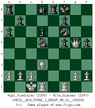 Last move : 0-1 2023 January 12 7:37:44 [Event "FICGS__CHESS__WCH_STAGE_1_GROUP_SM_01__000026"] [Site "FICGS"] [Date "2022.11.02"] [Round "1"] [White "Hybl,Vladislav"] [Black "Rita,Giacomo"] [Result "0-1"] [WhiteElo "2330"] [BlackElo "2347"] 1.e4 c5 2.Nf3 d6 3.d4 cxd4 4.Nxd4 Nf6 5.Nc3 a6 6.f3 e5 7.Nb3 Be6 8.Be3 h5 9.Nd5 Bxd5 10.exd5 g6 11.Qd2 Nbd7 12.O-O-O Nb6 13.Qa5 Bh6 14.Bxh6 Rxh6 15.Qd2 Rh8 16.f4 exf4 17.Qxf4 Kf8 18.Bd3 Kg7 19.Nd4 Re8 20.Rhf1 Nbxd5 21.Nf5+ gxf5 22.Qg5+ Kf8 0-1 Follow this game move after move (download)After a bad opening, there is hope for the middle game. After a bad middle game, there is hope for the endgame. But once you are in the endgame, the moment of truth has arrived. (Edmar Mednis) Ein Schachspiel besteht aus drei Phasen: Die erste, wenn du hofftst den Vorteil zu haben, die zweite, wenn du glaubst einen Vorteil zu haben, und die dritte.... wenn du weißt Du wirst verlieren. (Savielly Grigorievitsch Tartakower) El Ajedrez es tortura mental. (Garry Kasparov) On peut tirer plus d'utilité d'une partie perdue que de 100 parties gagnées. (Capablanca) If only faces could talk... (Pat Summerall, Sportscaster during the Super Bowl)