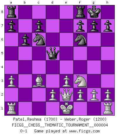 Last move : 0-1 2006 October 25 19:48:30 [Event "FICGS__CHESS__THEMATIC_TOURNAMENT__000004"] [Site "FICGS"] [Date "2006.06.28"] [Round "1"] [White "Patel,Reshma"] [Black "Weber,Roger"] [Result "0-1"] [WhiteElo "1700"] [BlackElo "1200"] 1.b4 e5 2.Bb2 Bxb4 3.Bxe5 Nf6 4.c4 d6 5.Bb2 Nc6 6.e3 b6 7.a3 Ba5 8.Nc3 Ba6 9.Nf3 Bxc3 10.Bxc3 O-O 11.Be2 d5 12.cxd5 Bxe2 13.Qxe2 Qxd5 0-1 This chess game has been lost on time (started : 2006.06.28 11:29:44) Polish (Sokolsky) opening Kingside Castling by player Black (move 10) Player Black won this chess game. Follow this game move after move (download)Chess is a fairy tale of 1001 blunders. (Savielly Tartakower) Wie bekannt hörte Morphy 1859 auf, Schach zu spielen. Seine Enttäuschung galt nicht so sehr dem Schach, wie den Schachspielern. (Robert James Fischer) Diferente gente reacciona diferentemente en aceptar la derrota. (Bobby Fischer) On peut tirer plus d'utilité d'une partie perdue que de 100 parties gagnées. (Capablanca) Hello Thibault, if I have had a plan (and I had one, I hope), I have forgotten it during the last week... - Hello Heinz-Georg. What do you mean a plan ? (Anonymous players, during a Big Chess game)