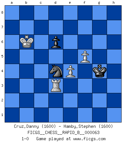 Last move : 1-0 2008 January 23 8:45:58 [Event "FICGS__CHESS__RAPID_B__000063"] [Site "FICGS"] [Date "2007.08.14"] [Round "1"] [White "Cruz,Danny"] [Black "Hamby,Stephen"] [Result "1-0"] [WhiteElo "1600"] [BlackElo "1600"] 1.d4 Nf6 2.c4 e5 3.dxe5 Ne4 4.Nf3 Bb4+ 5.Nbd2 Nc6 6.a3 Nxd2 7.Bxd2 Bxd2+ 8.Qxd2 Qe7 9.Qc3 O-O 10.O-O-O Re8 11.Rd5 b6 12.Qd3 Nd8 13.e3 Ne6 14.Kb1 Nc5 15.Qc2 Bb7 16.Rd4 Rad8 17.h4 Bxf3 18.gxf3 Qxe5 19.Rg4 Kh8 20.b4 Nb7 21.Bd3 Nd6 22.Rhg1 g6 23.f4 Qf6 24.e4 Qe6 25.Qc3+ Kg8 26.f3 a5 27.h5 axb4 28.axb4 Ra8 29.hxg6 fxg6 30.f5 Qe5 31.Qxe5 Rxe5 32.fxg6 h5 33.Rg5 Rxg5 34.Rxg5 Ra3 35.Rd5 h4 36.Kb2 Rxd3 37.Rxd3 Nxc4+ 38.Kc3 Ne5 39.Rd5 d6 40.f4 Nxg6 41.Rg5 Kh7 42.Rh5+ Kg7 43.f5 Ne5 44.b5 Nf3 45.Kc4 Kf7 46.Kd5 Kf6 47.Kc6 Nd4+ 48.Kxc7 Nxb5+ 49.Kxb6 Nd4 50.Rxh4 Kg5 51.Rh3 Kg4 52.Rd3 1-0 Budapest : Fajarowicz variation Kingside Castling by player Black (move 9) Queenside Castling by player White (move 10) 10 pieces endgame at move 48 : White KRPPP , Black KNPPP WHITE : King + 1 Rook 3 Pawns BLACK : King + 1 Knight 3 Pawns 9 pieces endgame at move 48 : White KRPP , Black KNPPP WHITE : King + 1 Rook 2 Pawns BLACK : King + 1 Knight 3 Pawns 8 pieces endgame at move 49 : White KRPP , Black KNPP WHITE : King + 1 Rook 2 Pawns BLACK : King + 1 Knight 2 Pawns 7 pieces endgame at move 50 : White KRPP , Black KNP WHITE : King + 1 Rook 2 Pawns BLACK : King + 1 Knight 1 Pawn Player White won this chess game. Follow this game move after move (download)During a Chess competition a Chessmaster should be a combination of a beast of prey and a monk. (Alexander Alekhine) Offensichtlich kennt Kasparow nichts anderes als Schach, und ich könnte 500 weitere Spieler dieser Sorte benennen. (Judith Polgar) Fischer deseaba darle a los Rusos una sopa de su propia medicina. (Larry Evans) Les Echecs représentent une sphère d'idées créatrices basée sur la volonté des deux protagonistes. (Smyslov) Waiting for chance ? Play in casinos. (FICGS proverb)