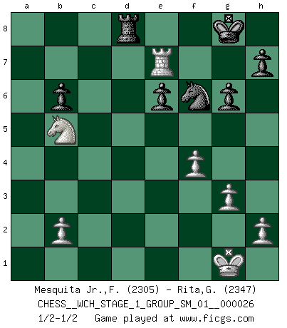 Last move : 1/2-1/2 2023 January 17 14:45:9 [Event "FICGS__CHESS__WCH_STAGE_1_GROUP_SM_01__000026"] [Site "FICGS"] [Date "2022.11.02"] [Round "1"] [White "Mesquita Jr.,Fausto Monteiro"] [Black "Rita,Giacomo"] [Result "1/2-1/2"] [WhiteElo "2305"] [BlackElo "2347"] 1.Nf3 Nf6 2.c4 e6 3.g3 d5 4.Bg2 dxc4 5.Qa4+ Bd7 6.Qxc4 c5 7.Ne5 Qc8 8.Nc3 Nc6 9.Nxd7 Qxd7 10.O-O Be7 11.d3 Rc8 12.a4 b6 13.Bxc6 Qxc6 14.a5 O-O 15.Qb5 Nd5 16.Qxc6 Rxc6 17.axb6 axb6 18.Nb5 Bf6 19.Ra2 Nb4 20.Ra7 Nd5 21.f4 g6 22.e4 Nb4 23.e5 Bg7 24.Rd1 f6 25.d4 Nd5 26.Bd2 R6c8 27.Bc3 cxd4 28.exf6 Bxf6 29.Bxd4 Rfd8 30.Bxf6 Nxf6 31.Rxd8+ Rxd8 32.Re7 1/2-1/2 Follow this game move after move (download)Chess demands total concentration. (Bobby Fischer) Ich kenne Menschen, die allen Willen der Welt besitzen und doch nicht Schach spielen können. (Robert James Fischer) El jugador de combinación piensa hacia adelante; comienza de la posición dada y trabaja las movidas contundentes en su mente. (Emanuel Lasker) Toutes les manuvres exécutées sur une colonne ouverte ont pour but ultime l'intrusion définitive sur la septième ou la huitième rangée, en plein cur de la position ennemie. (Aaron Nimzovitch) Rules and bones are meant to be broken. (Anonymous)