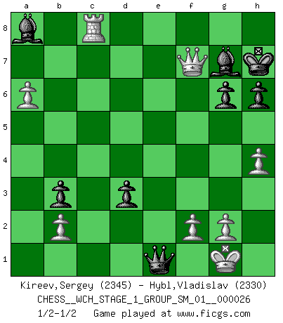 Last move : 1/2-1/2 2023 January 27 21:34:42 [Event "FICGS__CHESS__WCH_STAGE_1_GROUP_SM_01__000026"] [Site "FICGS"] [Date "2022.11.02"] [Round "1"] [White "Kireev,Sergey"] [Black "Hybl,Vladislav"] [Result "1/2-1/2"] [WhiteElo "2345"] [BlackElo "2330"] 1.e4 e5 2.Nf3 Nc6 3.Bb5 a6 4.Ba4 Nf6 5.O-O Be7 6.Re1 b5 7.Bb3 O-O 8.a4 Bb7 9.d3 d6 10.Nbd2 Na5 11.Ba2 c5 12.Nf1 b4 13.c3 Rb8 14.cxb4 cxb4 15.Bd2 Ba8 16.Ne3 Re8 17.Rc1 h6 18.Nh4 d5 19.Nhf5 b3 20.Bb1 Nc6 21.Ng4 Bf8 22.Qf3 Nxg4 23.Qxg4 Kh8 24.d4 Nxd4 25.Nxd4 dxe4 26.Rxe4 g6 27.Re3 exd4 28.Rxe8 Qxe8 29.Bd3 Bg7 30.a5 Kg8 31.Bxa6 d3 32.Bc4 Kh7 33.Qf4 Rc8 34.a6 Qe2 35.h4 Rc5 36.Qxf7 Rxc4 37.Rxc4 Qxd2 38.Rc8 Qe1+ 1/2-1/2 Follow this game move after move (download)Half the variations which are calculated in a tournament game turn out to be completely superfluous. Unfortunately, no one knows in advance which half. (Jan Tinman) Über Kasparov: Es ist offensichtlich, daß er in einem totalitären Staat aufwuchs und deshalb zu diktatorischen Zügen neigt. (Viktor Kortschnoi) La enorme capacidad mental, en la que sin ella no puede un jugador de Ajedrez existir, es demasiado requerida por el Ajedrez al grado de que nunca podrá liberar su mente de este juego. (Albert Einstein) La vie et les Echecs sont tous les deux une lutte constante. (Lasker) Ah, the Socrating method. The best way we have of teaching everything-apart from juggling chainsaws. (Gregory House, House M.D.)