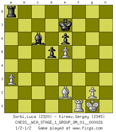 Last move : 1/2-1/2 2022 November 23 13:59:27 [Event "FICGS__CHESS__WCH_STAGE_1_GROUP_SM_01__000026"] [Site "FICGS"] [Date "2022.11.02"] [Round "1"] [White "Sorbi,Luca"] [Black "Kireev,Sergey"] [Result "1/2-1/2"] [WhiteElo "2320"] [BlackElo "2345"] 1.d4 e6 2.e4 d5 3.Nc3 Nf6 4.e5 Nfd7 5.f4 c5 6.Nf3 Nc6 7.Be3 a6 8.Qd2 b5 9.a3 Qa5 10.dxc5 Bxc5 11.Bxc5 Nxc5 12.Ne2 Qb6 13.Qe3 b4 14.c3 bxc3 15.b4 Na4 16.Qxb6 Nxb6 17.Nxc3 f6 18.Bd3 Ke7 19.O-O Bd7 20.h4 h6 21.Ne2 Rhc8 22.Rab1 fxe5 23.fxe5 g5 24.hxg5 hxg5 25.Bxa6 Rc7 26.b5 g4 27.bxc6 gxf3 28.Rxb6 Rxc6 29.Rxc6 fxe2 30.Bxe2 Bxc6 1/2-1/2 Follow this game move after move (download)It's always better to sacrifice your opponent's men. (Savielly Tartakover) Man wirke der falschen Auffassung entgegen, als ob jeder Zug Unmittelbares zu leisten habe; auch Werte- und Ruhezüge haben ihre Existenzberechtigung. (Aaron Nimzowitsch) Del Ajedrez se ha dicho que la vida no es lo suficientemente larga para él, pero eso es culpa de la vida, no del Ajedrez. (William Ewart Napier) Psychologiquement, tu dois avoir confiance en toi même, mais cette confiance doit être basée sur des faits. (Robert Fischer) Faith : not wanting to know what is true. (Friedrich Nietzsche)
