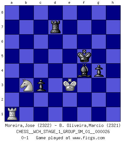 Last move : 0-1 2023 March 2 22:58:2 [Event "FICGS__CHESS__WCH_STAGE_1_GROUP_SM_01__000026"] [Site "FICGS"] [Date "2022.11.02"] [Round "1"] [White "Moreira,Jose"] [Black "B. Oliveira,Marcio"] [Result "0-1"] [WhiteElo "2322"] [BlackElo "2321"] 1.e4 c5 2.Nf3 Nc6 3.d4 cxd4 4.Nxd4 Nf6 5.Nc3 e5 6.Ndb5 d6 7.Nd5 Nxd5 8.exd5 Nb8 9.a4 Be7 10.Be2 O-O 11.Bd2 Bf5 12.O-O Nd7 13.a5 a6 14.Na3 Be4 15.c4 Bg6 16.b4 Rc8 17.Rc1 f5 18.f3 h6 19.Kh1 f4 20.Qb3 Bh4 21.Bd3 Qg5 22.c5 dxc5 23.Nc4 Rf6 24.Qb1 Bxd3 25.Qxd3 Rg6 26.g4 h5 27.Qf5 Rd8 28.bxc5 hxg4 29.fxg4 Qxf5 30.gxf5 Rh6 31.Bb4 Be7 32.d6 Bf6 33.Rb1 Rh3 34.Kg2 Rh4 35.Nd2 Kf7 36.Ba3 Rb8 37.c6 bxc6 38.Rxb8 Nxb8 39.Rb1 Nd7 40.Rb7 Ke8 41.Ne4 f3+ 42.Kxf3 Rh3+ 43.Ng3 Rxh2 44.Bc1 Nc5 45.Rb6 Kd7 46.Be3 Kxd6 47.Bxc5+ Kxc5 48.Rxa6 Kd5 49.Ra7 c5 50.Rc7 Ra2 51.Rd7+ Kc6 52.Rf7 Ra3+ 53.Kf2 e4 54.Nxe4 Bd4+ 55.Kf1 c4 56.Ng5 c3 57.Ne6 Be5 58.Rf8 Rxa5 59.Rc8+ Kd5 60.Ke2 Ke4 61.Nc5+ Kxf5 62.Ke3 Ra7 63.Kd3 Bf6 64.Nb3 Rd7+ 65.Ke3 g5 66.Rc5+ Be5 67.Ra5 g4 68.Ra1 Bf4+ 0-1 Follow this game move after move (download)No other master has such a terrific will to win. At the board he radiates danger, and even the strongest opponents tend to freeze, like rabbits when they smell a panther. Even his weaknesses are dangerous. As white, his opening game is predictable - you can make plans against it - but so strong that your plans almost never work. In the middle game his precision and invention are fabulous, and in the end game you simply cannot beat him. (Anonymous German Expert) Sitze auf Deine Hände. (Siegbert Tarrasch) Cuando tengo las piezas blancas, yo gano porque soy blanco; Cuando tengo las piezas negras, yo gano porque soy Bogolyubov. (Bogolyubov) Aux échecs, l'amour-propre est satisfait quand on remporte la victoire, mais il n'y a pas de honte à être battu. (Benjamin Franklin) When you have everything, sometimes it feels like nothing. (Horatio Caine, C.S.I. Miami)