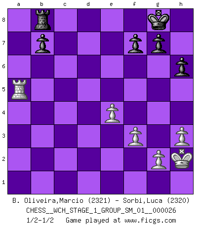 Last move : 1/2-1/2 2023 January 25 22:16:2 [Event "FICGS__CHESS__WCH_STAGE_1_GROUP_SM_01__000026"] [Site "FICGS"] [Date "2022.11.02"] [Round "1"] [White "B. Oliveira,Marcio"] [Black "Sorbi,Luca"] [Result "1/2-1/2"] [WhiteElo "2321"] [BlackElo "2320"] 1.c4 e5 2.Nc3 Nf6 3.Nf3 Nc6 4.e4 Bb4 5.d3 d6 6.a3 Bc5 7.b4 Bb6 8.Be3 Bg4 9.Be2 Bxf3 10.Bxf3 Nd4 11.Na4 Nxf3+ 12.Qxf3 Bxe3 13.Qxe3 O-O 14.O-O Re8 15.Rfd1 h6 16.d4 exd4 17.Rxd4 Ng4 18.Qe2 Qh4 19.h3 Nf6 20.f3 Nh5 21.Qf2 Qf6 22.Rad1 Nf4 23.Kh2 a5 24.b5 Rad8 25.R4d2 c6 26.Qb6 Qg5 27.Qe3 Qe5 28.Qd4 Qg5 29.Qf2 cxb5 30.cxb5 Qxb5 31.Nb6 Qb3 32.a4 d5 33.Nxd5 Nxd5 34.Rxd5 Rxd5 35.Rxd5 Qxa4 36.Qa7 Qb4 37.Qxa5 Qxa5 38.Rxa5 Rb8 1/2-1/2 Follow this game move after move (download)I'd rather have a Pawn than a finger. (Reuben Fine) Ich erzeugte keinen Neid, da mich die Schachspieler als Musiker und die Musiker als Schachspieler betrachteten. (Mark Taimanov) El Ajedrez hace al hombre ser mas sabio y ver mas claro. (Vladimir Putin) Tous ces prétendus hommes politiques sont les pions, les Cavaliers, les Tours ou les Fous d'une partie d'échecs qui se jouera tant qu'un hasard ne renversera pas l'échiquier. (Honoré de Balzac) Man is reluctant to give credit for intelligence to anyone, except his enemies. (Albert Einstein)
