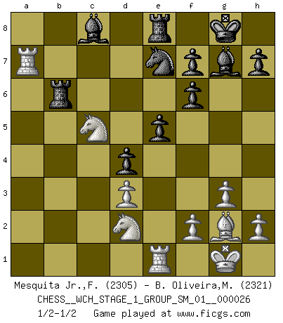 Last move : 1/2-1/2 2023 January 17 18:51:22 [Event "FICGS__CHESS__WCH_STAGE_1_GROUP_SM_01__000026"] [Site "FICGS"] [Date "2022.11.02"] [Round "1"] [White "Mesquita Jr.,Fausto Monteiro"] [Black "B. Oliveira,Marcio"] [Result "1/2-1/2"] [WhiteElo "2305"] [BlackElo "2321"] 1.Nf3 d5 2.g3 Nf6 3.Bg2 c5 4.O-O e6 5.c4 d4 6.d3 Nc6 7.e3 Bd6 8.exd4 cxd4 9.Na3 O-O 10.Nc2 e5 11.b4 Re8 12.Re1 a6 13.Bg5 Bf5 14.Nh4 Bd7 15.Nf3 Bf5 16.c5 Bf8 17.Nh4 Bd7 18.Nf3 b6 19.cxb6 Rb8 20.Nd2 Qxb6 21.Bxf6 gxf6 22.a3 Ne7 23.Rc1 Bh6 24.Na1 a5 25.bxa5 Qxa5 26.Nab3 Qxa3 27.Ra1 Qb4 28.Ne4 Bg7 29.Nbc5 Bc8 30.Qc2 Qb2 31.Qxb2 Rxb2 32.Ra7 Rb6 33.Nd2 1/2-1/2 Follow this game move after move (download)Fischer prefers to enter Chess history alone. (Miguel Najdorf) Lisa Lane, amerikanische Schachmeisterin, hatte Fischer einmal als stärksten lebenden Spieler bezeichnet. Antwort: Das ist richtig, aber Lisa Lane ist eigentlich nicht in der Lage, das zu beurteilen. (Robert James Fischer) Un entendimiento a fondo de las continuaciones típicas del mate, hace de las combinaciones de sacrificio mas complicadas conducirlas a ellas no solo sin dificultad, sino casi de una manera natural. (Siegbert Tarrasch) Aidez vos pièces, elles vous aideront. (Paul Morphy) You must have a dream in order to have it come true. (A.P.J. Kalam)