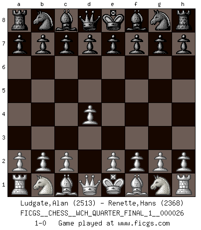 Last move : 1-0 2022 December 3 0:10:8 [Event "FICGS__CHESS__WCH_QUARTER_FINAL_1__000026"] [Site "FICGS"] [Date "2022.11.02"] [Round "7"] [White "Ludgate,Alan"] [Black "Renette,Hans"] [Result "1-0"] [WhiteElo "2513"] [BlackElo "2368"] 1.d4 1-0 This chess game has been lost on time (started : 2022.11.02 14:10:58) Follow this game move after move (download)No one ever won a game by resigning. (Unknown) Ich verachte Kasparow. (Viktor Kortschnoi) Un Peón pasado es un criminal, quién debe ser mantenido bajo candado y llave. Leves medidas, tales como vigilancia policiaca, no son suficientes. (Aaron Nimzovich) Ce qui caractérise les parties de combat, c'est que si le défenseur a constamment de difficiles problèmes à résoudre, l'attaquant doit chercher sans relâche de nouvelles possibilités d'attaque. (Koblentz) Waiting for chance ? Play in casinos. (FICGS proverb)
