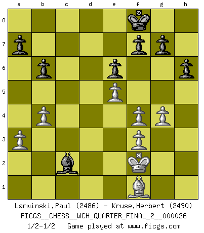 Last move : 1/2-1/2 2022 November 5 9:25:45 [Event "FICGS__CHESS__WCH_QUARTER_FINAL_2__000026"] [Site "FICGS"] [Date "2022.11.02"] [Round "8"] [White "Larwinski,Paul"] [Black "Kruse,Herbert"] [Result "1/2-1/2"] [WhiteElo "2486"] [BlackElo "2490"] 1.d4 d5 2.Nf3 Nf6 3.Bf4 c5 4.e3 e6 5.Nbd2 Bd6 6.dxc5 Bxc5 7.c4 O-O 8.Be2 Nbd7 9.cxd5 Nxd5 10.Bg3 b6 11.O-O Bb7 12.h3 Rc8 13.e4 N5f6 14.Re1 Bb4 15.a3 Bxd2 16.Nxd2 Nc5 17.e5 Nfe4 18.Nxe4 Bxe4 19.Rc1 Qg5 20.Bf1 Rfd8 21.Qg4 Qxg4 22.hxg4 Bg6 23.Red1 h6 24.b4 Rxd1 25.Rxd1 Ne4 26.Bf4 Rc2 27.f3 Nc3 28.Rd2 Nd5 29.Rxc2 Bxc2 30.g3 Nxf4 31.gxf4 Kf8 32.Kf2 1/2-1/2 Follow this game move after move (download)There just isn't enough televised Chess. (David Letterman) Ein Schachgenie ist jemand der verdammt gut Schach spielt. (Jonathan Levitt) Siempre es mucho mejor sacrificar las piezas de tu oponente. (Savielly Tartakover) Le plus grand jeu de l'esprit jamais inventé, plus vous l'apprenez, plus vous y prenez du plaisir. (Garry Kasparov) The human is the only animal species whose members are able to talk themselves into difficulties that would not otherwise exist. (Wendell Johnson)