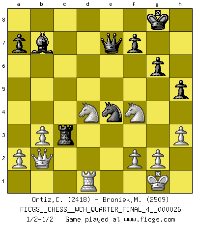Last move : 1/2-1/2 2023 January 3 6:30:14 [Event "FICGS__CHESS__WCH_QUARTER_FINAL_4__000026"] [Site "FICGS"] [Date "2022.11.02"] [Round "6"] [White "Ortiz,Clodomiro"] [Black "Broniek,Mariusz Maciej"] [Result "1/2-1/2"] [WhiteElo "2418"] [BlackElo "2509"] 1.d4 Nf6 2.c4 e6 3.Nf3 d5 4.Nc3 Bb4 5.cxd5 exd5 6.Bg5 h6 7.Bh4 Nbd7 8.Nd2 Be7 9.e3 O-O 10.Bd3 c5 11.O-O b6 12.Qc2 Bb7 13.Rad1 Rc8 14.Qb1 Nh5 15.Bh7+ Kh8 16.Bxe7 Qxe7 17.Bf5 Nhf6 18.Rfe1 g6 19.Bxd7 Qxd7 20.h3 Rfd8 21.Nf3 Kg7 22.Rc1 Ne4 23.b3 Qe7 24.Ne2 Qf6 25.Nf4 h5 26.Qb2 Rd7 27.Re2 Rdc7 28.Rec2 Kg8 29.Ne5 Qe7 30.dxc5 bxc5 31.Nf3 d4 32.exd4 cxd4 33.Rxc7 Rxc7 34.Rd1 Rc3 35.Nxd4 1/2-1/2 Follow this game move after move (download)The battle for the ultimate truth will never be won. And that's why Chess is so fascinating. (Hans Kmoch) Bobby Fischer ist kein Vorbild für die heutige Jugend. (Viktor Kortschnoi) El Ajedrez, como la música, como el amor, tiene el poder de hacer feliz a la gente. (Siegbert Tarrasch) Si rien de grave n'est détecté lors de l'analyse d'une position, on joue alors le coup. Seconde règle de Blumenfeld. However beautiful the strategy, you should occasionally look at the results. (Winston Churchill)