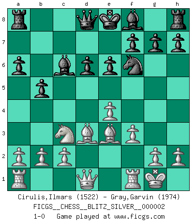 Last move : 1-0 2007 August 14 10:37:29 [Event "FICGS__CHESS__BLITZ_SILVER__000002"] [Site "FICGS"] [Date "2007.08.14"] [Round "1"] [White "Cirulis,Ilmars"] [Black "Gray,Garvin"] [Result "1-0"] [WhiteElo "1522"] [BlackElo "1974"] 1.e4 c5 2.Nf3 d6 3.d4 cxd4 4.Nxd4 Nf6 5.Nc3 a6 6.Bc4 e6 7.O-O b5 8.Bd3 Bb7 9.f3 Nc6 10.Nxc6 Bxc6 11.Be3 1-0 Sicilian : Najdorf, Lipnitzky attack Kingside Castling by player White (move 7) Player White won this chess game. Follow this game move after move (download)By the beauty of his games, the clarity of his play, and the brilliance of his ideas, Fischer made himself an artist of the same stature as Brahms, Rembrandt, and Shakespeare. (David Levy) Ohne Leiden bildet sich kein Charakter. (Ernst Freiherr von Feuchtersleben) Yo tuve un dolor de muelas en la primer partida. En el segundo juego, tuve un dolor de cabeza. En el tercero, tuve un ataque de reumatísmo. En la cuarta partida, no me sentía muy bien. ¿Y en el quinto juego? Bueno, ¿que acaso uno tiene que ganar todos los juegos?. (Siegbert Tarrasch) On a dit que l'homme se distingue de l'animal par le fait qu'il achète plus de livres qu'il ne peut en lire. Je voudrais suggérer qu'inclure à la liste des livres quelques livres d'échecs rendrait la distinction manifeste. (Edward Lasker) Indecision is the key to flexibility. (Unknown)