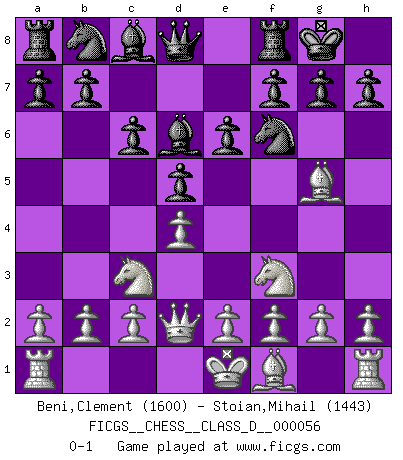 Last move : 0-1 2007 September 29 4:26:37 [Event "FICGS__CHESS__CLASS_D__000056"] [Site "FICGS"] [Date "2007.08.16"] [Round "1"] [White "Beni,Clement"] [Black "Stoian,Mihail"] [Result "0-1"] [WhiteElo "1600"] [BlackElo "1443"] 1.d4 Nf6 2.Nf3 d5 3.Bg5 Ne4 4.Bd2 e6 5.Nc3 Bd6 6.Qc1 Nf6 7.Bg5 O-O 8.Qd2 c6 0-1 This chess game has been lost on time (started : 2007.08.16 14:41:58) Queen's pawn game Kingside Castling by player Black (move 7) Player Black won this chess game. Follow this game move after move (download)The defensive power of a pinned piece is only imaginary. (Aaron Nimzovich) Je mehr wir mit Computern analysieren, desto mehr glauben wir an Verteidigung. (Vladimir Kramnik) Los problemas de Ajedrez exigen del compositor las mismas virtudes que caracterizan todo el arte de valor: originalidad, invención, concisión, armonía, complejidad e insinceridad explendida. (Vladimir Nabokov) Je ne suis pas le dernier à jouer lâchement des coups douteux pendant le zeïtnot de l'adversaire pour l'achever: en effet les coups qui font le plus peur sont ceux que l'on ne comprend pas. Je me fais souvent peur quand je joue. (Un professeur anonyme) Live, lose, and learn, by observing your opponent how to win. (Amber Steenbock)