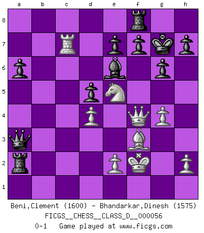 Last move : 0-1 2008 January 4 10:31:28 [Event "FICGS__CHESS__CLASS_D__000056"] [Site "FICGS"] [Date "2007.08.16"] [Round "1"] [White "Beni,Clement"] [Black "Bhandarkar,Dinesh"] [Result "0-1"] [WhiteElo "1600"] [BlackElo "1575"] 1.d4 Nf6 2.Nf3 d5 3.Nc3 g6 4.Bg5 Bg7 5.Qd2 O-O 6.O-O-O Nc6 7.Bh6 a6 8.g3 b5 9.Bxg7 Kxg7 10.Qe3 Ng4 11.Qf4 Nxf2 12.Bg2 Nxh1 13.Bxh1 b4 14.Ne5 bxc3 15.Nxc6 cxb2+ 16.Kxb2 Qd7 17.Ne5 Qb5+ 18.Kc1 Rb8 19.Rf1 Bf5 20.g4 Qb2+ 21.Kd2 Qxc2+ 22.Ke3 Qc3+ 23.Kf2 Be6 24.Rc1 Qa3 25.Rxc7 Rb2 26.Bf3 Rxa2 0-1 This chess game has been lost on time (started : 2007.08.16 14:41:58) Queen's pawn game Kingside Castling by player Black (move 5) Queenside Castling by player White (move 6) Player Black won this chess game. Follow this game move after move (download)Only sissies Castle. (Rob Sillars) Über Karpov: Er war und ist ein Vertreter der russischen Reaktionäre. Das steckt tief in seiner Seele, wehalb ich nicht nett mit ihm umgehen kann. (Viktor Kortschnoi) Por tratar de evitar la pérdida de una pieza, muchas personas han perdido una partida de Ajedrez. (Savielly Tartakover) C'est une question de caractère, Beaucoup de gens perdent leur motivation très vite. D'autres, ils sont rares, peuvent la conserver très longtemps. J'aime les échecs, encore aujourd'hui je suis heureux d'analyser des parties. J'aime toujours gagner, je déteste encore perdre. Bien jouer est important pour mon intégrité intellectuelle et morale. Et puis les échecs vivent en ce moment une période historique grâce à Internet. Ils se développent dans les systèmes éducatifs à travers le monde. Ils sortent de leur ghetto, et c'est mon rôle de mener à bien cette révolution. (Gary Kasparov) The real voyage of discovery consists not in seeking new lands but in seeing with new eyes. (Marcel Proust)