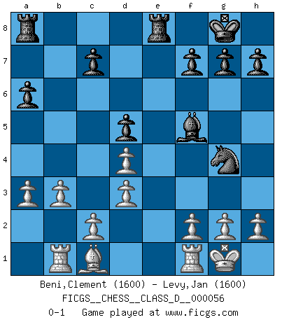 Last move : 0-1 2007 December 11 20:44:49 [Event "FICGS__CHESS__CLASS_D__000056"] [Site "FICGS"] [Date "2007.08.16"] [Round "1"] [White "Beni,Clement"] [Black "Levy,Jan"] [Result "0-1"] [WhiteElo "1600"] [BlackElo "1600"] 1.e3 e5 2.Nc3 d5 3.Nf3 Nc6 4.Bb5 a6 5.Bxc6+ bxc6 6.Nxe5 Nf6 7.Nxc6 Qd6 8.Nd4 Be7 9.b3 O-O 10.Nf5 Qe6 11.Nd4 Qg4 12.O-O Bb4 13.a3 Bxc3 14.Qxg4 Nxg4 15.Rb1 Bxd4 16.exd4 Bf5 17.d3 Rfe8 0-1 This chess game has been lost on time (started : 2007.08.16 14:41:58) Van't Kruijs Opening Kingside Castling by player Black (move 9) Kingside Castling by player White (move 12) Player Black won this chess game. Follow this game move after move (download)Chess, like any creative activity, can exist only through the combined efforts of those who have creative talent, and those who have the ability to organize their creative work. (Mikhail Botvinnik) Jeder Fehler erscheint unglaublich dumm, wenn andre ihn begehen. (Georg Christoph Lichtenberg) Un mal día en el Ajedrez, es mejor que cualquier buen día en el trabajo. (Anonymous) L'attaque fait le spectacle, la défense gagne les matchs. (Dicton footballistique) Luck is the residue of design. (John Milton)