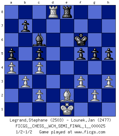 Last move : 1/2-1/2 2023 January 22 12:1:18 [Event "FICGS__CHESS__WCH_SEMI_FINAL_1__000025"] [Site "FICGS"] [Date "2022.11.04"] [Round "7"] [White "Legrand,Stephane"] [Black "Lounek,Jan"] [Result "1/2-1/2"] [WhiteElo "2503"] [BlackElo "2477"] 1.e4 e5 2.Nf3 Nf6 3.Nxe5 d6 4.Nf3 Nxe4 5.Nc3 Nxc3 6.dxc3 Be7 7.Be3 O-O 8.Qd2 Nd7 9.O-O-O Nf6 10.Bd3 c5 11.Rhe1 Be6 12.Kb1 Qa5 13.c4 Qxd2 14.Nxd2 Rfe8 15.Ne4 Rad8 16.h3 h6 17.b3 Bd7 18.Nc3 Bc6 19.Bf1 a6 20.a4 Bf8 21.Bf4 g5 22.Rxe8 Rxe8 23.Bxd6 Bxd6 24.Rxd6 Ne4 25.Nxe4 Rxe4 26.Rd1 a5 27.f3 Re5 28.Kc1 Kg7 29.Kd2 f5 30.Be2 Kf6 31.Ke1 h5 32.Rd8 Re8 33.Rd6+ Re6 34.Rd8 Re8 35.Rd6+ Re6 36.Rd8 Re8 1/2-1/2 Follow this game move after move (download)Good offense and good defense both begin with good development. (Bruce A. Moon) Die Neutralität betrachte ich als eine schwere Krankheit. (Viktor Kortschnoi) El arma más poderosa en el Ajedrez, es tener la próxima movida. (David Bronstein) Les réformistes prétendent que les progrès de la théorie conduiront à la disparition des échecs, et qu'il faut, pour leur rendre vie, en remanier les règles. En réalité, qu'exprime cette affirmation? Le mépris de l'intuition, de l'imagination et de tous les autres éléments qui font des échecs un art. (Alexander Alekhine) This is where the fun begins. (Anakin Skywalker in Star Wars ep.3)