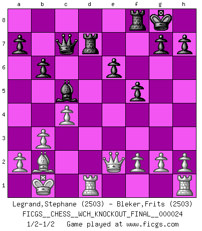 Last move : 1/2-1/2 2022 December 21 21:57:7 [Event "FICGS__CHESS__WCH_KNOCKOUT_FINAL__000024"] [Site "FICGS"] [Date "2022.11.04"] [Round "2"] [White "Legrand,Stephane"] [Black "Bleker,Frits"] [Result "1/2-1/2"] [WhiteElo "2503"] [BlackElo "2503"] 1.d4 d5 2.c4 c6 3.Nf3 Nf6 4.e3 e6 5.b3 Nbd7 6.Bd3 Bd6 7.Bb2 O-O 8.Nbd2 b6 9.e4 dxe4 10.Nxe4 Nxe4 11.Bxe4 Bb7 12.Bc2 c5 13.Qd3 Nf6 14.O-O-O Be4 15.Qe2 Bxc2 16.Kxc2 Qc7 17.Kb1 Rad8 18.dxc5 Bxc5 19.Ne5 Nd7 20.Nxd7 Rxd7 21.Qg4 f5 22.Qe2 Kf7 23.Qh5+ Kg8 24.Qe2 Kf7 25.Qh5+ Kg8 26.Qe2 1/2-1/2 Follow this game move after move (download)By playing at Chess then, we may learn: First: Foresight... Second: Circumspection... Third: Caution... And lastly, we learn by Chess the habit of not being discouraged by present bad appearances in the state of our affairs, the habit of hoping for a favorable chance, and that of persevering in the secrets of resources. (Benjamin Franklin) Schach ist die gewalttätigste aller Sportarten. (Garry Kasparov) El Ajedrez te enseña a controlarl la excitación inicial que sientes cuando vez algo que parece bueno y te enseña a pensar objetivamente cuando te encuentras en problemas. (Stanley Kubrick) La victoire dans une partie d'Echecs appartient la plupart du temps à celui qui voit un peu plus loin que l'adversaire. (Lasker) Go and wake up your luck. (Persian saying)
