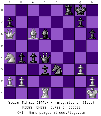 Last move : 0-1 2008 January 6 22:48:50 [Event "FICGS__CHESS__CLASS_D__000056"] [Site "FICGS"] [Date "2007.08.16"] [Round "1"] [White "Stoian,Mihail"] [Black "Hamby,Stephen"] [Result "0-1"] [WhiteElo "1443"] [BlackElo "1600"] 1.Nf3 d5 2.g3 c6 3.Bg2 Bg4 4.O-O Nd7 5.d4 e6 6.c4 Ngf6 7.Bg5 Bd6 8.Nc3 dxc4 9.e4 e5 10.Qa4 Bxf3 11.Bxf3 exd4 12.Ne2 h6 13.Bxf6 Qxf6 14.Bg2 d3 15.Nc3 Qd4 16.Rfe1 Ne5 17.Rad1 O-O 18.Re3 b5 19.Qa6 b4 20.Na4 f5 21.exf5 Rxf5 22.Bxc6 Rxf2 23.Kxf2 Ng4+ 24.Kg2 Nxe3+ 25.Kh1 Rf8 0-1 Reti : King's Indian attack (Barcza system) Kingside Castling by player White (move 4) Kingside Castling by player Black (move 17) Player Black won this chess game. Follow this game move after move (download)The blunders are all there on the board, waiting to be made. (Savielly Tartakover) Intelligenz läßt sich nicht am Weg, sondern nur am Ergebnis feststellen. (Garry Kasparov) Una victoria por una combinación errónea, aunque sea espectacular, me llena de horror artístico. (Wilhelm Steinitz) La tactique est l'élément le plus important du milieu de jeu. (Siegbert Tarrasch) In every real man a child is hidden that wants to play. (Friedrich Nietzsche)