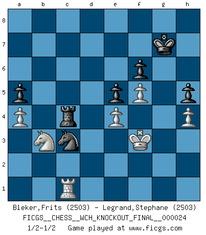 Last move : 1/2-1/2 2023 February 25 9:24:6 [Event "FICGS__CHESS__WCH_KNOCKOUT_FINAL__000024"] [Site "FICGS"] [Date "2022.11.04"] [Round "5"] [White "Bleker,Frits"] [Black "Legrand,Stephane"] [Result "1/2-1/2"] [WhiteElo "2503"] [BlackElo "2503"] 1.d4 Nf6 2.c4 e6 3.g3 d5 4.Bg2 Be7 5.Nf3 O-O 6.O-O dxc4 7.Qc2 a6 8.a4 Bd7 9.Qxc4 Bc6 10.Bf4 Bd6 11.Qc1 a5 12.Nc3 Na6 13.Bd2 Re8 14.Rd1 h6 15.Qb1 Bb4 16.Bf4 Bd6 17.Be5 Bxe5 18.Nxe5 Bxg2 19.Kxg2 c5 20.Qd3 Rc8 21.Rac1 cxd4 22.Qxd4 Nc5 23.Nb5 Qxd4 24.Rxd4 Nb3 25.Rxc8 Rxc8 26.Rd3 Nc5 27.Rd4 Nb3 28.Rd3 Nc5 29.Ra3 Rd8 30.Nc4 Ra8 31.Nd4 b6 32.Nxb6 Rb8 33.Nc4 Rb4 34.b3 Nfe4 35.Ra2 f6 36.f4 Nxb3 37.Nxb3 Nc3 38.Rc2 Rxc4 39.Kf3 Kf7 40.h4 h5 41.e4 e5 42.f5 g5 43.Rc1 gxh4 44.gxh4 Kg7 1/2-1/2 Follow this game move after move (download)The older I grow, the more I value Pawns. (Keres) Alle offensichtlichen Züge sehen nach dem Spiel in der Analyse verdächtig aus. (Viktor Kortschnoi) Existen dos clases de sacrificios: los correctos y los míos. (Mikhail Tal) Le jeu d'échecs est comme rejeté hors du temps. (Antoine de Saint-Exupéry) Experiences are the keys to life. (Daniel Parmet)