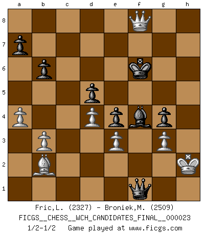 Last move : 1/2-1/2 2023 April 12 7:41:0 [Event "FICGS__CHESS__WCH_CANDIDATES_FINAL__000023"] [Site "FICGS"] [Date "2022.11.04"] [Round "6"] [White "Fric,Lubos"] [Black "Broniek,Mariusz Maciej"] [Result "1/2-1/2"] [WhiteElo "2327"] [BlackElo "2509"] 1.d4 Nf6 2.c4 e6 3.g3 d5 4.Bg2 Bb4+ 5.Bd2 Be7 6.Qc2 c6 7.Nf3 Nbd7 8.Bf4 O-O 9.O-O b6 10.cxd5 cxd5 11.Rc1 Bb7 12.Qb3 Rc8 13.Rxc8 Qxc8 14.Nc3 Bc6 15.Rc1 Qb7 16.Nb5 Bxb5 17.Qxb5 Rc8 18.Qa4 Rxc1+ 19.Bxc1 Ne4 20.Qc2 h6 21.Ne1 Nb8 22.e3 g6 23.Bf1 h5 24.Kg2 Kg7 25.b3 Nc6 26.a3 Bd6 27.Bb5 Ne7 28.Bd3 f5 29.Nf3 Qc6 30.Qd1 Ng8 31.a4 Ngf6 32.Ng1 Ng4 33.Nh3 Qc3 34.Qc2 Qe1 35.Bxe4 fxe4 36.Ng5 Kf6 37.Nh7+ Kg7 38.Ng5 h4 39.Nxe6+ Kf6 40.Nf4 g5 41.Nh3 Nxh2 42.Kxh2 Qf1 43.Bb2 g4 44.Nf4 hxg3+ 45.fxg3 Bxf4 46.Qc6+ Kg7 47.Qd7+ Kf6 48.Qd8+ Ke6 49.Qe8+ Kf6 50.Qf8+ Kg6 51.Qe8+ Kf6 52.Qf8+ Kg6 53.Qe8+ Kf6 54.Qf8+ 1/2-1/2 Follow this game move after move (download)Chess is the gymnasium of the mind. (Blaise Pascal) Jeder Schachmeister war einmal ein Anfänger. (Irving Chernev) Una de estas pequeñas movidas modestas pudieran ser mas molestas a tu oponente que la amenaza mas grande. (Siegbert Tarrasch) Le système Elo représente seulement une moyenne. Il est simplement un indicateur de votre stabilité. (Anatoli Karpov) When you stop learning you start dying. (Scott Adams)