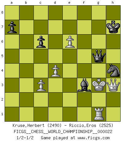 Last move : 1/2-1/2 2023 May 11 22:38:49 [Event "FICGS__CHESS__WORLD_CHAMPIONSHIP__000022"] [Site "FICGS"] [Date "2022.11.04"] [Round "6"] [White "Kruse,Herbert"] [Black "Riccio,Eros"] [Result "1/2-1/2"] [WhiteElo "2490"] [BlackElo "2525"] 1.e4 e5 2.Nf3 Nf6 3.Nxe5 d6 4.Nf3 Nxe4 5.Bd3 Nf6 6.O-O Be7 7.Re1 O-O 8.Bf1 d5 9.d4 Be6 10.c3 Bd6 11.Bg5 Nbd7 12.Ne5 c6 13.Nxd7 Bxd7 14.Bd3 Re8 15.Rxe8+ Bxe8 16.Nd2 h6 17.Bh4 Bd7 18.Qf3 g5 19.Bg3 Bg4 20.Qe3 Qd7 21.Be5 Re8 22.f4 Bf5 23.Rf1 g4 24.h3 h5 25.Qg3 Be7 26.Be2 Bd8 27.Qh4 Ne4 28.Qxh5 Rxe5 29.fxe5 Ng3 30.Qh6 Nxe2+ 31.Kh2 Bd3 32.Qe3 Ba6 33.c4 dxc4 34.Ne4 gxh3 35.Qf2 c3 36.bxc3 Qd5 37.gxh3 Nf4 38.Rg1+ Ng6 39.Nc5 Bc4 40.h4 Kh8 41.Qf5 Be2 42.Nxb7 Nxh4 43.Qh3 Qxa2 44.Kg3 Bg5 45.Nd6 Bf3 46.e6 Qd2 47.Nxf7+ Kh7 48.Nxg5+ Qxg5+ 49.Kh2 Qd2+ 50.Kg3 Qg5+ 51.Kh2 Qd2+ 52.Kg3 Qg5+ 1/2-1/2 Follow this game move after move (download)Robert Fischer is a law unto himself. (Larry Evans) Ich suche im Schach immer etwas Eigenes. Riskantes Spiel im Stile schachlicher Musketiere ist nicht meine Sache, auch wenn es vielen Freunden scharfer Wendungen gefällt. (Anatoly Karpov) Coloca el contenido de las piezas del Ajedrez en un sombrero, agitalo vigorosamente, arrojalas en un tablero desde una altura de 30 centimetros y así obtendras el estilo de Steinitz. (H. E. Bird) La victoire dans une partie d'Echecs appartient la plupart du temps à celui qui voit un peu plus loin que l'adversaire. (Lasker) I feel so... helpless. (C-3PO in Star Wars ep.3)