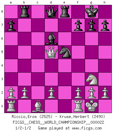 Last move : 1/2-1/2 2022 December 27 5:41:22 [Event "FICGS__CHESS__WORLD_CHAMPIONSHIP__000022"] [Site "FICGS"] [Date "2022.11.04"] [Round "9"] [White "Riccio,Eros"] [Black "Kruse,Herbert"] [Result "1/2-1/2"] [WhiteElo "2525"] [BlackElo "2490"] 1.e4 c5 2.Nc3 Nc6 3.Nge2 Nd4 4.Nxd4 cxd4 5.Ne2 e5 6.c3 d5 7.cxd4 exd4 8.Qa4+ Bd7 9.Qxd4 dxe4 10.Qxe4+ Be7 11.Qxb7 Nf6 12.Ng3 Rb8 13.Qf3 O-O 14.Be2 Bg4 15.Qd3 Bd6 16.O-O Re8 17.Bxg4 Nxg4 18.Qf3 Ne5 19.Qd5 1/2-1/2 Follow this game move after move (download)Suddenly it was obvious to me in my analysis I had missed what Fischer had found with the greatest of ease at the board. (Mikhail Botvinnik) Die größte Kunst beim Schach besteht darin dem Gegner nicht zu zeigen was er tun kann. (Garry Kasparov) No hay un Gran Maestro de Ajedrez que sea normal; solo se diferencían ellos por la magnitud de su locura. (Viktor Korchnoi) Le jeu d'échecs est comme rejeté hors du temps. (Antoine de Saint-Exupéry) If you lose the game you should win the analysis! (Proverb)