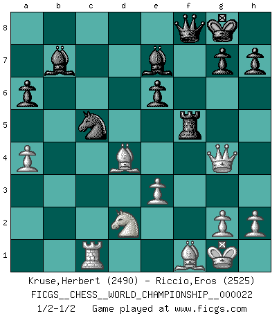 Last move : 1/2-1/2 2022 December 28 7:9:5 [Event "FICGS__CHESS__WORLD_CHAMPIONSHIP__000022"] [Site "FICGS"] [Date "2022.11.04"] [Round "12"] [White "Kruse,Herbert"] [Black "Riccio,Eros"] [Result "1/2-1/2"] [WhiteElo "2490"] [BlackElo "2525"] 1.e3 d5 2.c4 dxc4 3.Bxc4 Nf6 4.Qc2 c5 5.Nf3 e6 6.O-O a6 7.Rd1 b5 8.Bf1 Bb7 9.a4 Nbd7 10.d4 b4 11.Nbd2 Be7 12.dxc5 Nxc5 13.b3 O-O 14.Bb2 Rc8 15.Rac1 Nfd7 16.Ne5 Nxb3 17.Qxb3 Rxc1 18.Nxf7 Rxf7 19.Rxc1 Nc5 20.Qxb4 Rxf2 21.Qg4 Qf8 22.Bc3 Rf5 23.Bd4 Rg5 24.Qf4 Rf5 25.Qg4 Rg5 26.Qf4 Rf5 27.Qg4 1/2-1/2 Follow this game move after move (download)Avoid the crowd. Do your own thinking independently. Be the Chess player, not the Chess piece. (Ralph Charell) Im Wettkampf zwischen starken Meistern kommen Fehler sehr selten vor, deshalb ist es mit bloßem Warten nicht getan. (José Raúl Capablanca) Me dio la sensación de como si yo estuviera jugando en contra del mismo Ajedrez. - al estar jugando en contra de Robert Fischer (Walter Shipman) Des points faibles ou des trous dans la position de l'adversaire doivent être occupés par des pièces et non pas par des pions. (Siegbert Tarrasch) Life is like a game of cards: the hand you are dealt represents determinism; the way you play it is free will. (Jawaharlal Nehru)