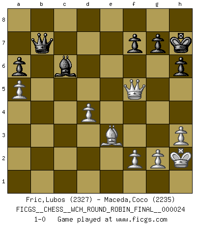 Last move : 1-0 2023 March 7 2:7:59 [Event "FICGS__CHESS__WCH_ROUND_ROBIN_FINAL__000024"] [Site "FICGS"] [Date "2022.11.05"] [Round "1"] [White "Fric,Lubos"] [Black "Maceda,Coco"] [Result "1-0"] [WhiteElo "2327"] [BlackElo "2235"] 1.e4 e5 2.Nf3 Nc6 3.Bb5 a6 4.Ba4 Nf6 5.O-O Be7 6.Re1 b5 7.Bb3 O-O 8.a4 b4 9.a5 d6 10.c3 Rb8 11.Bc4 d5 12.exd5 Nxd5 13.d4 bxc3 14.Nxc3 Be6 15.Bxd5 Bxd5 16.Nxe5 Nxe5 17.Rxe5 Bc4 18.h3 Bd6 19.Re1 Re8 20.Ne4 h6 21.Nxd6 Qxd6 22.Ra3 Rxe1+ 23.Qxe1 Rb3 24.Rxb3 Bxb3 25.Qe8+ Kh7 26.Qe4+ Qg6 27.Qb7 Ba4 28.Qxc7 Bc6 29.Qg3 Qe4 30.Be3 Qb1+ 31.Kh2 Qxb2 32.Qe5 Qb7 33.Qf5+ 1-0 This chess game has been lost on time (started : 2022.11.05 15:51:8) Follow this game move after move (download)I am still a victim of Chess. It has all the beauty of art and much more. It cannot be commercialized. Chess is much purer than art in its social position. (Marcel Duchamp) Auf jeden Fall musst du zuerst Rechtsanwalt werden, damit du deine eigenen Interessen und die deiner Familie vertreten kannst. [Brief an seinen Sohn] (José Raúl Capablanca) Creo que una cierta cantidad de temperamento es esperada de los genios del Ajedrez. (Ron Gross) Shah mat. Le roi est mort. Cri de fierté d'un joueur venant de terrasser son adversaire, courtoisement, sans effusion de sang. Crush them ! Make them suffer ! (General Grievous in Star Wars ep.3)