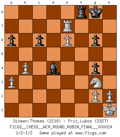 Last move : 1/2-1/2 2023 February 6 12:26:46 [Event "FICGS__CHESS__WCH_ROUND_ROBIN_FINAL__000024"] [Site "FICGS"] [Date "2022.11.05"] [Round "1"] [White "Dineen,Thomas"] [Black "Fric,Lubos"] [Result "1/2-1/2"] [WhiteElo "2218"] [BlackElo "2327"] 1.d4 Nf6 2.c4 e6 3.Nf3 d5 4.Nc3 c6 5.Bg5 h6 6.Bxf6 Qxf6 7.e3 Nd7 8.Bd3 dxc4 9.Bxc4 g6 10.O-O Bg7 11.Qc2 Qe7 12.Ne4 O-O 13.Bb3 e5 14.Ng3 Kh8 15.Rad1 Re8 16.dxe5 Nxe5 17.Nxe5 Bxe5 18.f4 Bg7 19.e4 Bg4 20.Rde1 Bd4+ 21.Kh1 Rad8 22.Qc1 Kg7 23.f5 Qg5 24.fxg6 fxg6 25.Rf7+ Kh8 26.Qxg5 hxg5 27.Rxb7 Be6 28.Bxe6 Rxe6 29.Rf1 g4 30.b4 a6 31.Rbf7 Be5 32.a3 Rd2 33.Ra7 Rf6 34.Re1 Rfd6 35.Re7 Rd1 36.Rg1 Bb2 37.e5 R6d2 38.e6 Bd4 39.Rf1 Rxf1+ 40.Nxf1 Rf2 41.Ng3 Kg8 42.Re8+ Rf8 43.Re7 1/2-1/2 Follow this game move after move (download)Fischer Chess play was always razor-sharp, rational and brilliant. One of the best ever. (Dave Regis) Es gibt keine einzige Frau, der ich nicht einen Springer vorgeben könnte und trotzdem gewänne. (Robert James Fischer) El Ajedrez es la vida. (Bobby Fischer) La vie est comme un jeu d'échecs : nous esquissons un plan, mais celui-ci est tributaire de ce que daignent faire l'adversaire aux échecs et le destin dans la vie. (Arthur Schopenhauer) I don't know, I don't care, and it doesn't make any difference. (Albert Einstein)