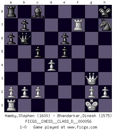 Last move : 1-0 2007 September 15 10:56:7 [Event "FICGS__CHESS__CLASS_D__000056"] [Site "FICGS"] [Date "2007.08.16"] [Round "1"] [White "Hamby,Stephen"] [Black "Bhandarkar,Dinesh"] [Result "1-0"] [WhiteElo "1600"] [BlackElo "1575"] 1.d4 d5 2.e4 dxe4 3.Nc3 Nf6 4.f3 exf3 5.Nxf3 e6 6.Bd3 Bd6 7.O-O Nbd7 8.Qe1 O-O 9.Qh4 c5 10.Nb5 Be7 11.Bg5 a6 12.Bxh7+ Nxh7 13.Bxe7 Qb6 14.Nd6 Ndf6 15.Bxf6 gxf6 16.Qg3+ Kh8 17.Ne5 fxe5 18.Nxf7+ Rxf7 19.Rxf7 1-0 Blackmar gambit Kingside Castling by player White (move 7) Kingside Castling by player Black (move 8) Player White won this chess game. Follow this game move after move (download)The mistakes are there, waiting to be made. (Savielly Tartakower) Nicht daß Diemer aus Opportunismus Mitglied der NSDAP geworden wäre. Er war ein Fanatiker, in allem, was er tat. (Hans Ree) Los Peones son nacidos libres, y aún así, se encuentran por doquier encadenados. (Rick Kennedy) J'ai toujours senti une vague pitié pour l'homme qui ne connaît rien aux échecs, tout comme j'en aurais pour un homme ignorant de l'amour. Les Echecs, comme la musique ou comme l'amour, ont le pouvoir de rendre heureux. (Siegbert Tarrasch) I don't believe in psychology. I believe in good moves. (Bobby Fischer)