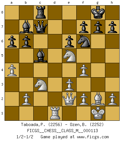 Last move : 1/2-1/2 2023 January 13 2:10:23 [Event "FICGS__CHESS__CLASS_M__000113"] [Site "FICGS"] [Date "2022.11.08"] [Round "1"] [White "Taboada,Pedro Pablo"] [Black "Ozen,Bahadir"] [Result "1/2-1/2"] [WhiteElo "2256"] [BlackElo "2252"] 1.d4 d5 2.Nf3 Nf6 3.c4 e6 4.g3 Bb4+ 5.Bd2 Be7 6.Bg2 O-O 7.O-O c6 8.Qc2 b6 9.Bf4 Nbd7 10.Rd1 Bb7 11.Nc3 dxc4 12.Nd2 Nd5 13.Nxc4 Nxf4 14.gxf4 Qc7 15.e3 Rac8 16.a4 a6 17.Qe2 Rfd8 18.Rac1 Nf6 19.Ne5 c5 20.dxc5 Rxd1+ 21.Rxd1 Bxc5 1/2-1/2 Follow this game move after move (download)The hallmark of the artist is simplicity. (Larry Evans) Kostenjuk hat keinen Sexappeal. (Loek van Wely) El Ajedrez es realmente noventa y nueve por ciento calculación. (Soltis) Je fais ceci parce que dans cinquante coups j'obtiendrai cela; je m'appelle Mikhail Moisevitch Botvinnik. (Botvinnik) Whatever you do, don't be bored. This is absolutely the most exciting time we could have possibly hoped to be alive. And things are just starting. (From movie Waking life)