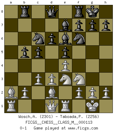 Last move : 0-1 2023 March 22 7:4:57 [Event "FICGS__CHESS__CLASS_M__000113"] [Site "FICGS"] [Date "2022.11.08"] [Round "1"] [White "Wosch,Arkadiusz"] [Black "Taboada,Pedro Pablo"] [Result "0-1"] [WhiteElo "2301"] [BlackElo "2256"] 1.e4 e5 2.Nf3 Nc6 3.Bc4 Nf6 4.d3 Be7 5.O-O O-O 6.Re1 d6 7.a4 Na5 8.Ba2 c5 9.c3 Nc6 10.Na3 a6 11.Bd2 Rb8 12.Nc4 b5 13.axb5 axb5 14.Ne3 Re8 15.Ng5 Rf8 16.Nf3 Be6 0-1 This chess game has been lost on time (started : 2022.11.08 18:27:26) Follow this game move after move (download)We like to think. (Gary Kasparov) Auf Remis zu spielen ist gewissermaßen ein Verbrechen gegen das Schachspiel. (Mikhail Nekhemyevich Tal) Muchos se han convertido en Maestros de Ajedrez, nadie se ha convertido en el Maestro del Ajedrez. (Siegbert Tarrasch) C'est une question de caractère, Beaucoup de gens perdent leur motivation très vite. D'autres, ils sont rares, peuvent la conserver très longtemps. J'aime les échecs, encore aujourd'hui je suis heureux d'analyser des parties. J'aime toujours gagner, je déteste encore perdre. Bien jouer est important pour mon intégrité intellectuelle et morale. Et puis les échecs vivent en ce moment une période historique grâce à Internet. Ils se développent dans les systèmes éducatifs à travers le monde. Ils sortent de leur ghetto, et c'est mon rôle de mener à bien cette révolution. (Gary Kasparov) The arrogant army will lose certainly the battle. (Chinese proverb)