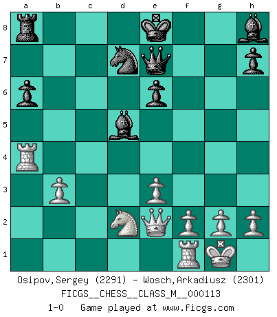 Last move : 1-0 2023 March 17 22:32:13 [Event "FICGS__CHESS__CLASS_M__000113"] [Site "FICGS"] [Date "2022.11.08"] [Round "1"] [White "Osipov,Sergey"] [Black "Wosch,Arkadiusz"] [Result "1-0"] [WhiteElo "2291"] [BlackElo "2301"] 1.d4 d5 2.c4 dxc4 3.Nf3 Nf6 4.e3 e6 5.Bxc4 c5 6.O-O a6 7.b3 b5 8.Be2 Bb7 9.Bb2 Nbd7 10.Nbd2 cxd4 11.Nxd4 Be7 12.a4 bxa4 13.Bf3 Nd5 14.Nxe6 fxe6 15.Bxg7 Bf6 16.Bxd5 Bxd5 17.Bxh8 Bxh8 18.Rxa4 Qe7 19.Qe2 1-0 This chess game has been lost on time (started : 2022.11.08 18:27:26) Follow this game move after move (download)You are for me the Queen on d8 and I am the Pawn on d7 !! (Eduard Gufeld) Es ist besser die Steine des Gegners zu opfern. (Savielly Grigorievitsch Tartakower) El Ajedrez es un expediente tonto que hace creer a la gente inactiva que hacen una cosa muy astuta cuando solamente estan perdiendo su tiempo. (George Bernard Shaw) Shah mat. Le roi est mort. Cri de fierté d'un joueur venant de terrasser son adversaire, courtoisement, sans effusion de sang. Knowledge rests not upon truth alone, but upon error also. (Carl G. Jung)