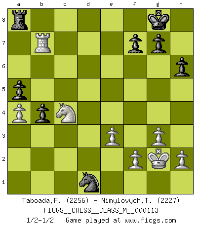 Last move : 1/2-1/2 2023 May 16 21:1:45 [Event "FICGS__CHESS__CLASS_M__000113"] [Site "FICGS"] [Date "2022.11.08"] [Round "1"] [White "Taboada,Pedro Pablo"] [Black "Nimylovych,Taras"] [Result "1/2-1/2"] [WhiteElo "2256"] [BlackElo "2227"] 1.d4 Nf6 2.c4 e6 3.Nf3 d5 4.g3 Bb4+ 5.Nbd2 dxc4 6.Bg2 b5 7.O-O O-O 8.Ne5 Nd5 9.a3 Bd6 10.b3 Bb7 11.Qc2 cxb3 12.Nxb3 Qc8 13.Bd2 Nb6 14.Nf3 Nc4 15.a4 Nxd2 16.Nbxd2 b4 17.Nc4 Nc6 18.Rfc1 h6 19.Ne1 Rd8 20.Nxd6 Rxd6 21.e3 a5 22.Nd3 Ne7 23.Qxc7 Qxc7 24.Rxc7 Bxg2 25.Kxg2 Nd5 26.Rc5 Nc3 27.Nb2 Ne4 28.Re5 Nc3 29.Rc5 Rd5 30.Rc7 e5 31.Nc4 exd4 32.Nb6 R5d8 33.Nxa8 d3 34.Nb6 d2 35.Nc4 d1Q 36.Rxd1 Nxd1 37.Rb7 Ra8 38.Nb6 Rf8 39.Nc4 Ra8 40.Nb6 Rd8 41.Nc4 Ra8 1/2-1/2 Follow this game move after move (download)In Fischer's hands, a slight theoretical advantage is as good a being a Queen ahead. (Isaac Kashdan) Sehr viele beherrschen heutzutage das große Einmalseins des Schachspiels und kennen sogar dessen Logarithmentafeln auswendig - deshalb sollte man hin und wieder zu beweisen trachten, dass zwei mal zwei auch fünf sein kann. (Mikhail Nekhemyevich Tal) El Ajedrez es una manera fabulosa para que los niños aprendan a autovalorarse y a autoestimarse. (Saudin Robovic) Aux échecs, les retours au sommet sont rares : les dommages psychologiques consécutifs à une défaite sont trop sévères. (Daily Telegraph) Work expands to fill the time available. (C. Northcote Parkinson, in Parkinson's Laws)