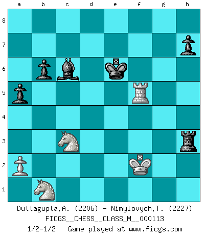 Last move : 1/2-1/2 2023 March 30 14:2:18 [Event "FICGS__CHESS__CLASS_M__000113"] [Site "FICGS"] [Date "2022.11.08"] [Round "1"] [White "Duttagupta,Aniruddha"] [Black "Nimylovych,Taras"] [Result "1/2-1/2"] [WhiteElo "2206"] [BlackElo "2227"] 1.d4 Nf6 2.c4 e6 3.Nc3 Bb4 4.Qc2 O-O 5.e4 d5 6.e5 Ne4 7.Bd3 c5 8.Nf3 cxd4 9.Nxd4 Nd7 10.Bf4 Qh4 11.g3 Qh5 12.O-O g5 13.cxd5 gxf4 14.dxe6 Nxe5 15.Nxe4 fxe6 16.gxf4 Rxf4 17.Kh1 Kh8 18.Rg1 Nxd3 19.Qxd3 b6 20.Nc6 e5 21.Rg5 Ba6 22.Qg3 Qe2 23.f3 Qxf3+ 24.Qxf3 Rxf3 25.Nxb4 Bb7 26.Re1 a5 27.Nc2 Rf2 28.Na3 Rxb2 29.Kg1 Rg8 30.Rxg8+ Kxg8 31.Nc3 Rg2+ 32.Kf1 Rxh2 33.Rxe5 Rh3 34.Nab1 Kf7 35.Kf2 Bc6 36.Rf5+ Ke6 37.Rf8 Ke7 38.Rf5 Ke6 39.Rf8 Ke7 40.Rf5 Ke6 1/2-1/2 Follow this game move after move (download)In Chess, just as in life, today's bliss may be tomorrow's poison. (Assaic) Es gibt keine einzige Frau, der ich nicht einen Springer vorgeben könnte und trotzdem gewänne. (Robert James Fischer) Cuando le juegas a Fischer, no es una cuestion de si vas a ganar o perder. Es una cuestion de si vas a sobrevivir. (Boris Spassky) Même un GMI sait rarement calculer sur plus de cinq coups une attaque à sacrifices. (Rudolf Spielmann) Luck has a peculiar habit of favoring those who don't depend on it. (Author unknown)