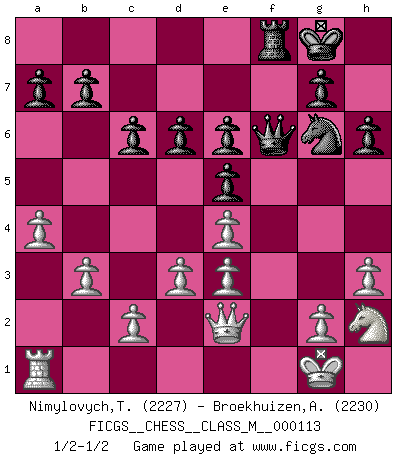 Last move : 1/2-1/2 2023 February 11 20:27:17 [Event "FICGS__CHESS__CLASS_M__000113"] [Site "FICGS"] [Date "2022.11.08"] [Round "1"] [White "Nimylovych,Taras"] [Black "Broekhuizen,A. T. S."] [Result "1/2-1/2"] [WhiteElo "2227"] [BlackElo "2230"] 1.e4 e5 2.Nf3 Nc6 3.Bc4 Bc5 4.d3 d6 5.a4 Nf6 6.Nc3 O-O 7.O-O h6 8.Be3 Bxe3 9.fxe3 Be6 10.b3 Qd7 11.h3 Rae8 12.Rf2 Ne7 13.Ne2 Ng6 14.Ng3 c6 15.Bxe6 fxe6 16.Nh2 Qe7 17.Qe2 Rf7 18.Nh5 Ref8 19.Nxf6+ Rxf6 20.Rxf6 Qxf6 1/2-1/2 Follow this game move after move (download)It is not enough to be a good player... you must also play well. (Siegbert Tarrasch) Ich kenne keine einzige Person, die behaupten würde, Garri Kasparow sei ein guter Mensch (Nigel Short) Cuando tengo las piezas blancas, yo gano porque soy blanco; Cuando tengo las piezas negras, yo gano porque soy Bogolyubov. (Bogolyubov) Même si l'adversaire joue le coup analysé précédemment, recommencez l'analyse en voyant la nouvelle position. Première règle de Blumenfeld It's not the will to win, but the will to prepare to win that makes the difference. (Bear Bryant)